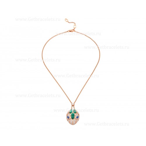 Colier Bvlgari Serpenti din aur roz de 18K cu ochi de safir albastru, elemente de malachit și diamante pavate pe pandantiv